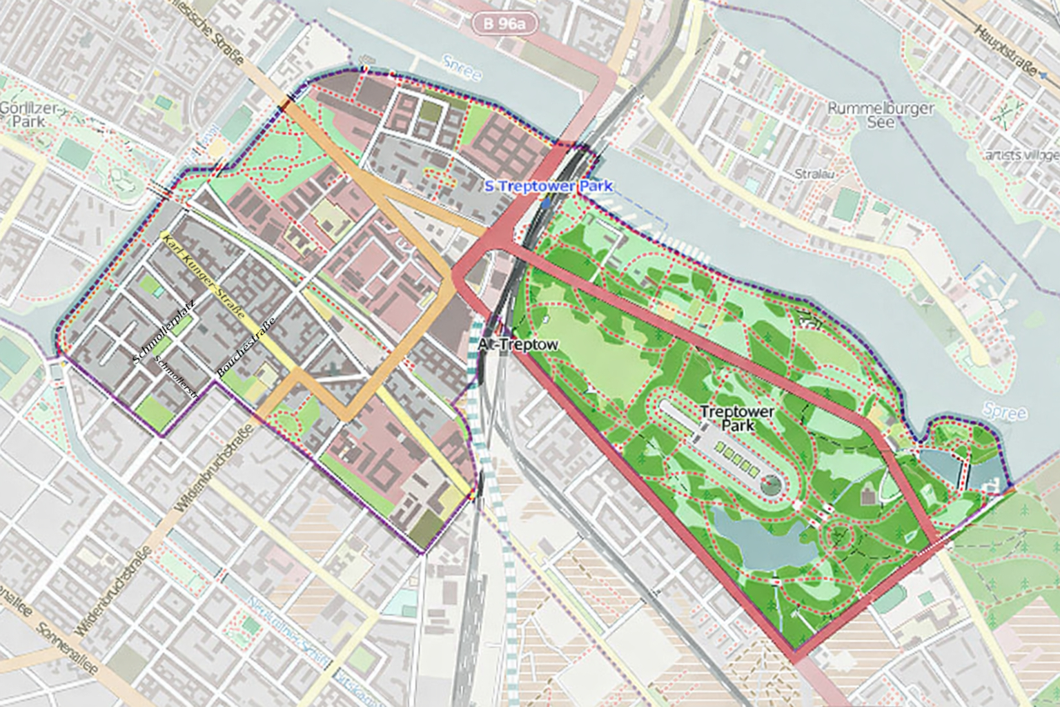 Map of Alt-Treptow and Treptower Park, modified, based on Wikipedia.
